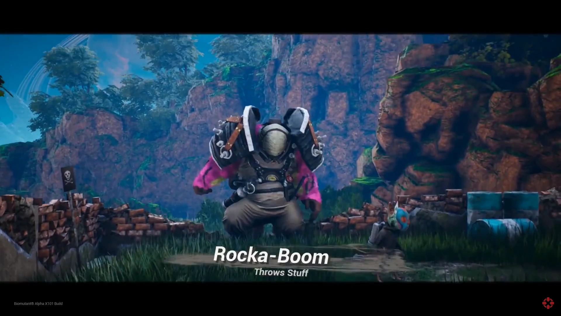 Rocka-Boom is an enemy in Biomutant that throws objects at you. It is a hulking pink and gray humanoid with shoulder plates and a gas mask.
